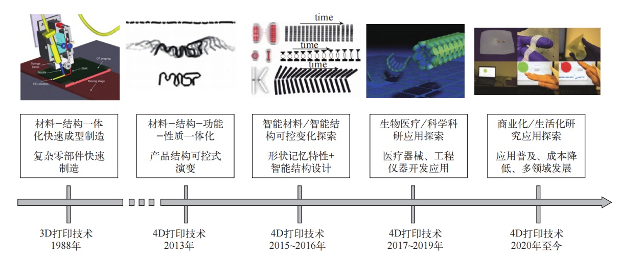 4D打印其实是在3D打印技术的基础上,增加了一个时间维度,通过可编程原理控制3D打印物体中的可变形要素,成型后物体的形状、性能等在受到光、热声、磁等环境刺激下可随时间再次发生变化,实现自动形变、自动修复、自动组装等功能,因此4D打印成为一种新型的以智能材料为驱动的变形实现技术。
