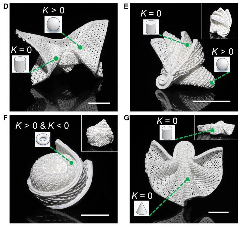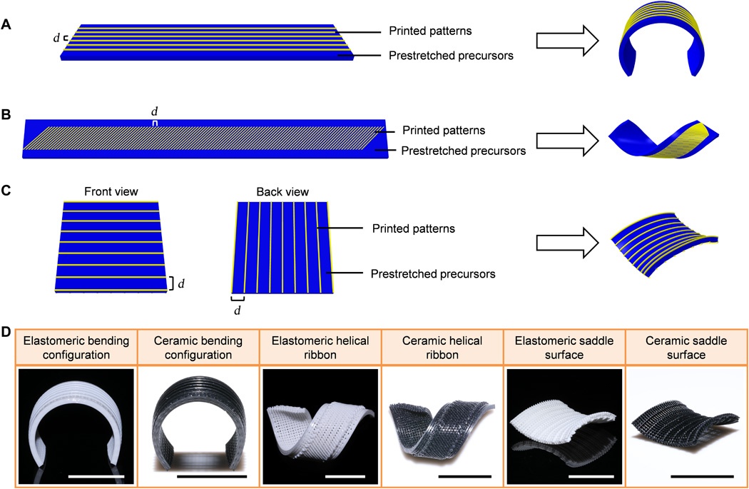 第二种方法是通过将陶瓷前驱体按照设计好的纹路打印在预拉伸的陶瓷前驱体上,在预应力被释放时,就会发生4D变形。通过设计在预拉伸表面打印的路径可以控制应力释放后的4D变形。文中以几个有代表性的拓扑结构作为例子,展示了弯曲,螺旋和马鞍面的打印过程。