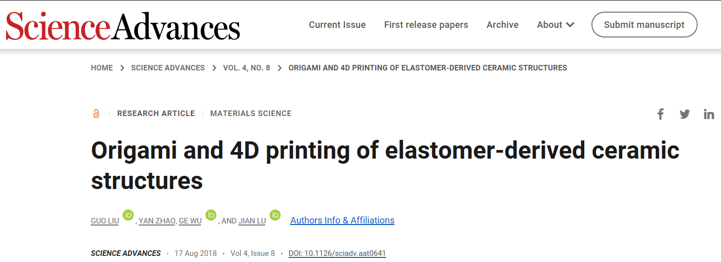 相关研究工作以“Origami and 4D printing of elastomer-derived ceramics”为题发表在《Science Advances》上。