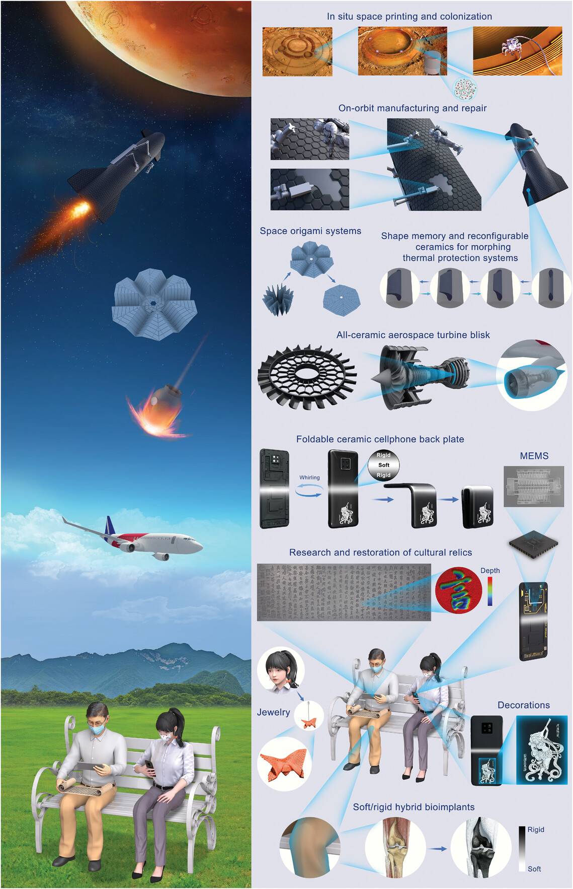 该工作首次实现了4D增减材复合制造陶瓷,亦首次实现了4D打印形状记忆陶瓷。该工作提出的4D增减材复合制造形状记忆陶瓷技术可实现高精度(十微米级),大尺寸(十厘米级),超快的前驱体转变为陶瓷的速度(几秒钟内),以及前驱体材料的快速制造(批量生产能力),有力推动了陶瓷4D打印技术的潜在应用发展,有望应用于航空航天(全陶瓷整体涡轮叶盘、可变形热防护系统,太空折叠系统,在轨制造和修复,原位太空打印和殖民等)、3C电子(可折叠陶瓷手机背板、微机电系统等)、生物医疗(生物植入物等)、和艺术(文物研究和修复、首饰、装饰品等)等领域。