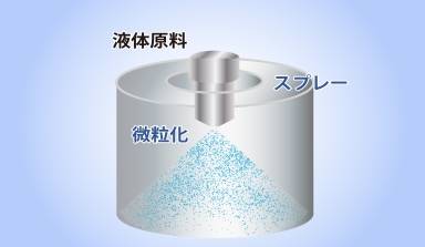 大川原的加压二流体喷嘴是一种全新的细粒化装置,会在液体喷嘴部分形成环形液膜,然后通过空气喷嘴向该液膜施加高速气流,从而实现高效细粒化的效果。其特点是通过调节空气流量,可以控制液滴的大小。即使是体积较大、粘度较高的原料,也能被成功雾化。
