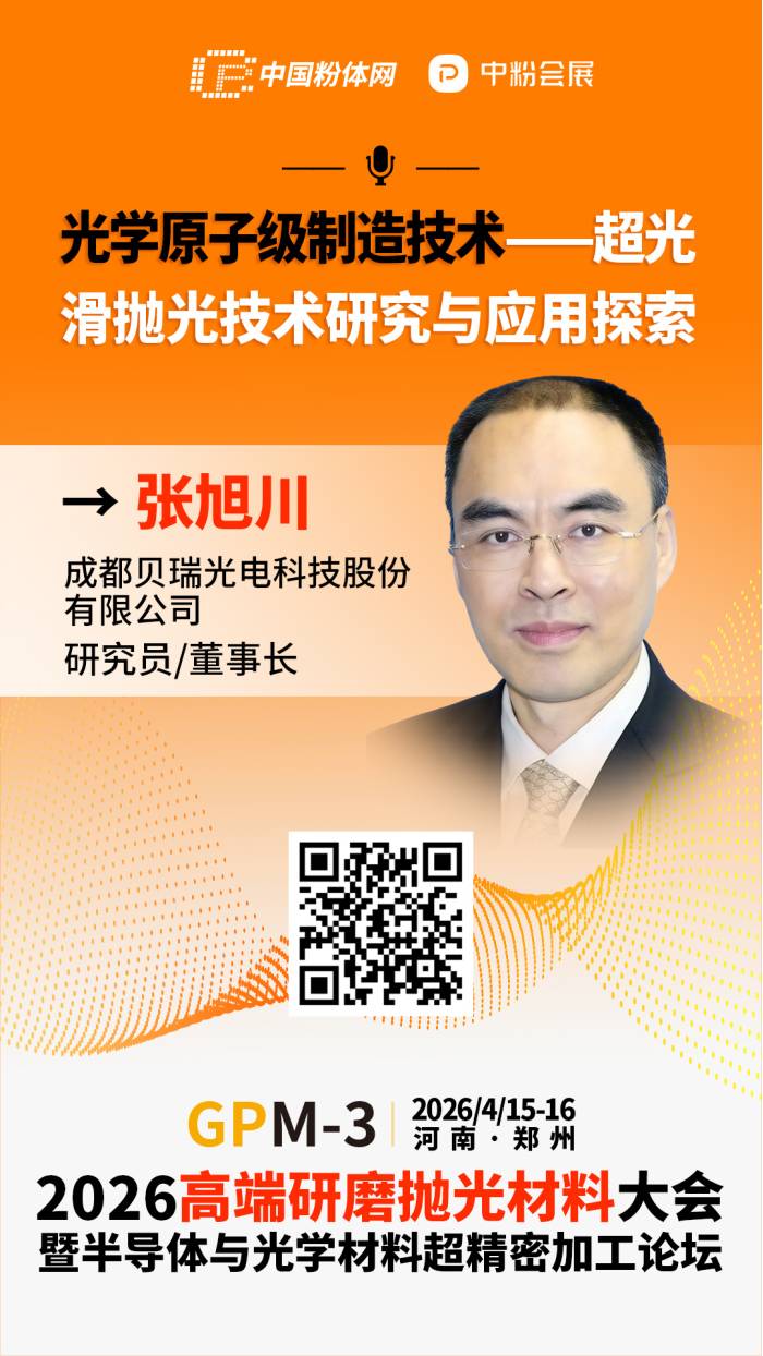 针对高端研磨抛光相关的技术、材料、设备、市场等方面的问题,中国粉体网将于2026年4月15日-4月16日在河南郑州举办2026高端研磨抛光材料大会暨半导体与光学材料超精密加工论坛。届时,成都贝瑞光电科技股份有限公司董事长张旭川将作题为《光学原子级制造技术——超光滑抛光技术研究与应用探索》的报告。报告将从超光滑抛光技术发展趋势、超光滑表面质量指标的定义及其作用原理以及贝瑞光电在多个领域研制的极端性的超光滑光学元件和作用,对超光滑抛光技术、超光滑光学元件及其应用作轮廓结构性的交流探索。