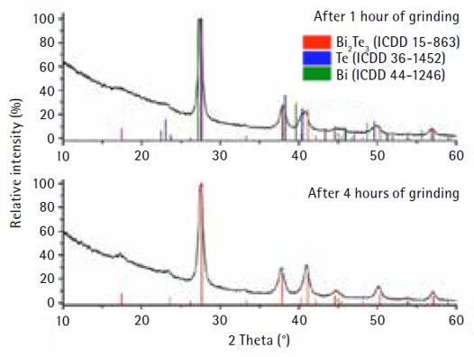 在经过近1小时机械合金研磨,Bi和Te的特征峰都有明显可辨的偏移,显示化合物Bi2Te3开始形成。球料比10:1的样品形成速度比5:1的更快,因为5:1样品中Te的特征峰值强度更大,说明10:1样品中的Te反应地更多。合金反应继续1200转/分3小时后,没有样品结块。