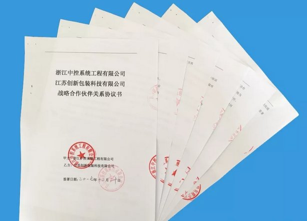 江苏创新包装科技有限公司董事长兼总经理方先其与浙江中控系统工程有限公司氟脂事业部总经理何国强于2017年12月20日在浙江中控签署江苏创新包装科技有限公司与浙江中控系统工程有限公司战略合作伙伴关系协议书,原中国有机颜料专业委员会秘书长王祖昌、浙江中控系统工程有限公司技术总监陈伟参加了签字仪式。