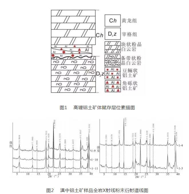 新发现的高锂铝土矿体位于滇中中部地区,为典型的喀斯特型铝土矿矿体,赋存于石炭纪黄龙组(Ch)底部,晚泥盆世宰格组(D3z)顶部(条带状粉晶白云岩)平行不整合界面之上(图1),矿体呈层状、似层状,严格受古喀斯特地形地貌控制,产状与地层基本一致,倾向350°~10°,倾角25°~30°;矿体走向长约6km,出露地表宽0.1~0.2km,矿体厚度0.5~1.5m,平均厚度0.8m。铝土矿样品全岩X射线粉末衍射谱线图(图2),测试结果表明,铝土矿组成矿物主要有硬水铝石、勃姆石、鲕绿泥石、高岭石、斜绿泥石、云母/伊利石、锐钛矿等,对各个样品的粉末X射线衍射图谱进行全图谱拟合和定量物相分析,得出矿物组成及含量见表1。