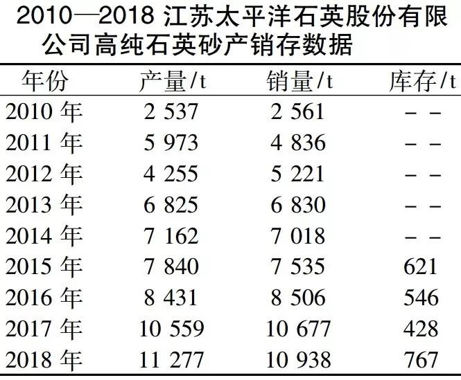 2018年,石英股份高纯石英砂产量为11277t,销售量10938t,其中外销2655t,自用8283t。