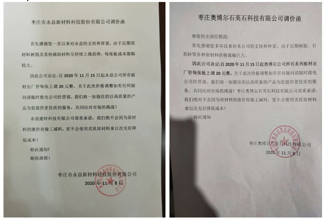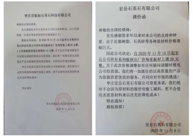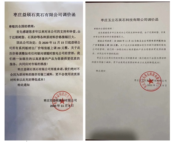 中国粉体网讯 山东枣庄是我国重点石英石板材生产基地,由于近期树脂、石英砂等各种原材料价格涨幅巨大,枣庄益硕石英石有限公司、枣庄玉立石英石科技有限公司、枣庄市永益新材料科技股份有限公司、枣庄奥博尔石英石科技有限公司、枣庄市航标石英石科技有限公司、宏岳石英石有限公司、海立石英石科技有限公司、山东博翊新型材料科技有新公司等集体发布调价函,表示板材出厂价每张板上调20元整,并承诺绝对不会因为原材料的涨价而偷工减料,更不会使用劣质原材料来以次充好降低成本。