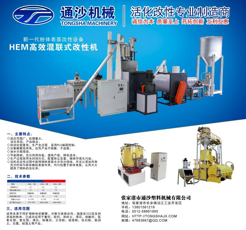 粉体活化改性和配方配料在同一活化主机中分步进行,可适用于多种配方、不同熔点物料的配料,工艺可变性强。机组不仅能用于常规碳酸钙材料的改性生产,同时也能满足材料比重特别轻或特别重的粉体改性生产。