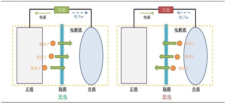 电池在充电时,锂离子从正极脱嵌,穿过电解质和隔膜,嵌入到负极材料之中。此时,负极处于富锂态,正极处于贫锂态,同时补偿电子从外电路供给到负极,保证负极的电荷平衡。而作为负极的碳呈层状结构,它有很多微孔,达到负极的锂离子就嵌入到碳层的微孔中,嵌入的锂离子越多,充电容量越高。放电时则相反,锂离子从负极脱嵌,穿过电解质和隔膜,重新嵌入到正极材料中,正极回到富锂态,回正极的锂离子越多,放电容量越高。这个过程十分类似一个摇椅,所以锂离子电池又俗称“摇椅电池”。