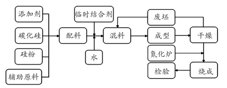 氮化硅结合碳化硅制品的生产工艺流程(图片来源:任云等,《影响氮化硅结合碳化硅制品质量的因素及其控制措施研究》)