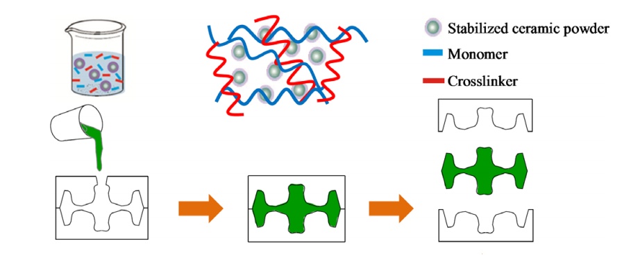 凝胶注模是近几年发展起来的新型陶瓷成型技术,可成型形状复杂均匀性良好的坯体,已成为陶瓷材料理想的成型技术。其成型方法是首先将陶瓷粉料分散于含有有机单体和交联剂的溶液中,制备成高固相体积分数的悬浮料浆,然后注入一定形状的模具中,在一定条件下使有机单体与交联剂发生反应,进而料浆原位固化成型。