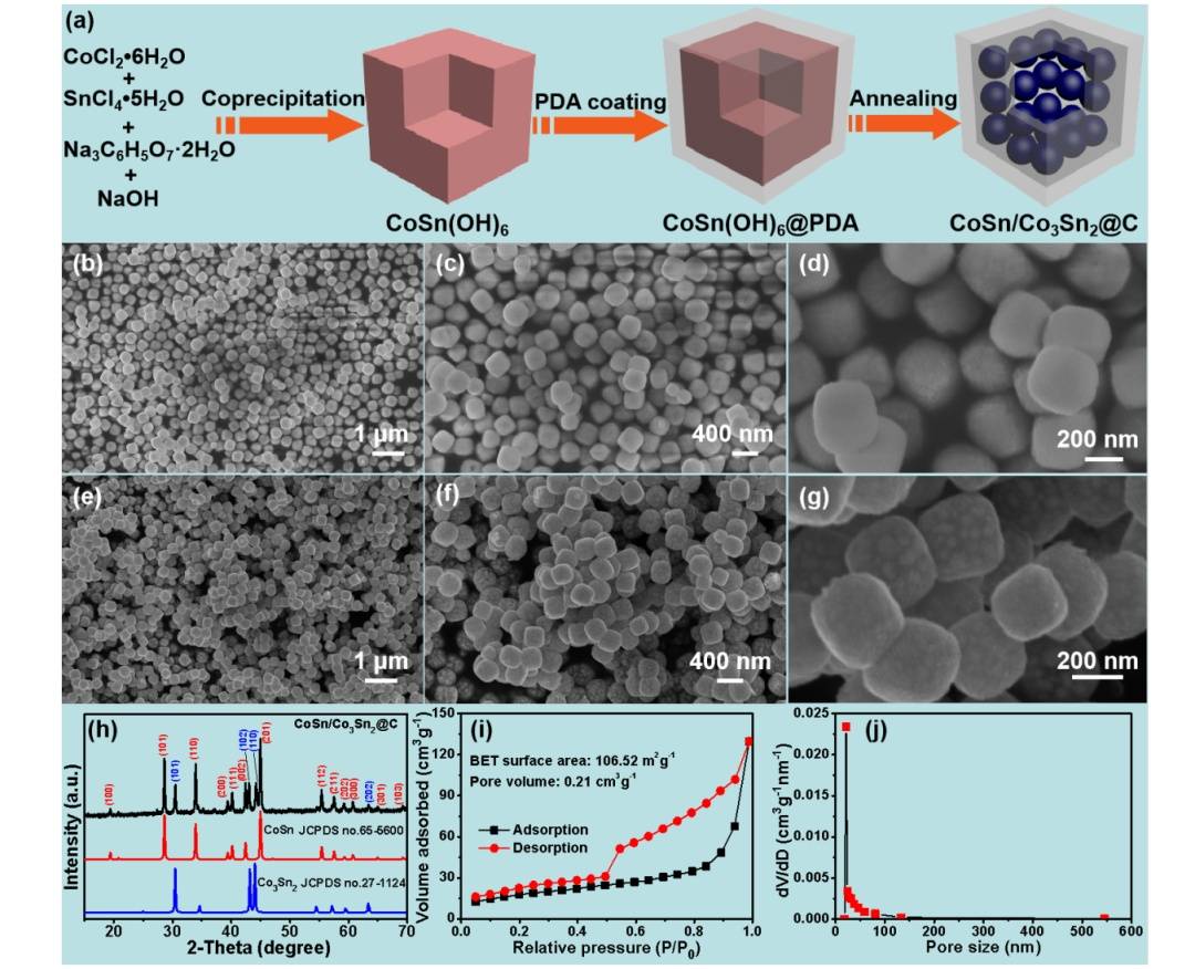 首先,通过共沉淀的方法制备了CoSn(OH)6前驱体。多巴胺原位聚合包覆在CoSn(OH)6纳米立方的表面。最后,在Ar气下500°C下退火3h,得到CoSn/Co3Sn2@C纳米盒子。图1b-d显示了CoSn(OH)6的扫描电镜(SEM)信号,很明显,这些颗粒具有均匀的纳米立方体形状,~尺寸为300nm。为了验证CoSn(OH)6纳米管在Ar气氛中退火后的形貌和晶体结构,我们进行了SEM和XRD表征,如图1e-h所示。从扫描电镜结果来看(图1e-g),处理后的样品仍然保持了CoSn(OH)6前驱体的相似形态,并且仍然保持了纳米球的形状。图1h显示了CoSn(JCPDS65-5600)和Co3Sn2标准卡(JCPDS27-1124)的XRD结果,样品的XRD峰位置与CoSn和Co3Sn2的标准卡匹配良好。样品的主要XRD峰可归属于CoSn的(101)、(110)、(201)晶面和Co3Sn2的(101)、(102)和(110)晶面。SEM和XRD结果表明成功制备了CoSn/Co3Sn2@C纳米盒子。图1i和图1j表示了CoSn/Co3Sn2@C纳米盒子的BET结果。这些CoSn/Co3Sn2@C纳米盒子的表面积为106.52m2g-1,孔隙体积为0.21cm3g-1,几乎所有孔径均在50nm以下,表明CoSn/Co3Sn2@C纳米盒子具有介孔结构。