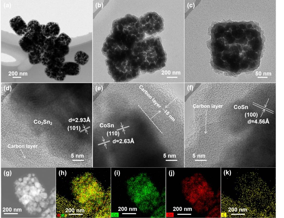 图2a-c的TEM图表明CoSn/Co3Sn2@C纳米盒子由CoSn或Co3Sn2纳米晶组成,且被包裹在碳纳米盒子内,纳米晶的尺寸在100nm以下。CoSn/Co3Sn2@C的高分辨率TEM(HRTEM)图(图2d-f)表明在CoSn或Co3Sn2颗粒的外层上覆盖着一个厚度为~15nm的非晶碳。这些晶格间距为4.56?、2.63?和2.93?的纳米粒子分别属于CoSn的(100)、(110)、(110)和(110)晶面。高角度环形暗场(HAADF)TEM图(图2g)进一步证明了CoSn/Co3Sn2@C具有由CoSn或Co3Sn2纳米颗粒组成的纳米盒子特征。EDX元素能谱分析(图2h-k)揭示了Co、Sn和C元素呈纳米盒子形状的均匀分布,进一步证明了通过合理的转化策略成功制备了CoSn/Co3Sn2@C纳米盒子。
