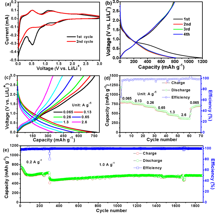 图3a是CoSn/Co3Sn2@C负极在0.01~3.0V区域的CV曲线图。在初始负扫过程中,位于0.6V的还原峰归因于电解液的分解形成SEI层和CoSn/Co3Sn2的合金化形成LiySn合金。在正扫描过程中,一个位于~0.48V的峰可以归因于锂从LiySn合金中脱出。图3b是CoSn/Co3Sn2@C负极的初始电压-容量曲线,曲线中的电压平台与CV结果中的阴极峰电位匹配良好。CoSn/Co3Sn2@C纳米盒子在0.1Ag-1下的首次容量-电压曲线(图3a)表明其放电/充电容量分别为1190.5/779.4mAhg-1,初始库仑效率(ICE)约为65.46%。第2~4容量-电压曲线重叠良好表明CoSn/Co3Sn2@C纳米盒子具有良好的循环稳定性。图3c是CoSn/Co3Sn2@C纳米盒子在不同电流密度(从65~2600mAg-1)下的容量-电压曲线。可以看出,随着充放电电流的增加,充放电电压平台差增大可能是由于电流极化增加所致。从图3d可以看出,这些CoSn/Co3Sn2@C纳米盒子在65、130、260、650、2600mAg-1电流密度下分别达到791.1、748.3、678.4、569.8、461.0和367.0mAhg-1。从图3e可以看出CoSn/Co3Sn2@C纳米盒子在1000mAg-1下的循环1600次后依然有571.2mAhg-1的比容量。
