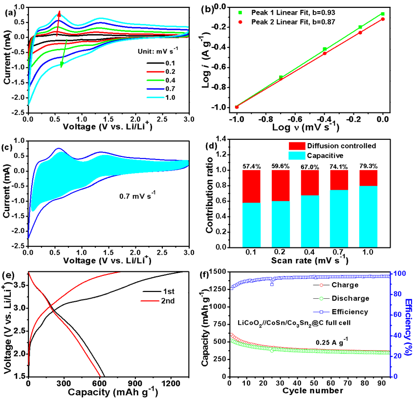 为了揭示CoSn/Co3Sn2@C纳米盒子中优越的Li+存储性能,对其进行了动力学分析。图4a是从0.1~1.0mVs-1不同扫描速率下的CV曲线。根据i=avb公式,可以得到峰值电流(i)与扫描速率(v)之间的关系,a和b为经验参数。当b值接近0.5时,Li+存储反应主要为Li+扩散,而b值近似于1,表明该反应被赝电容所占据。如图4b所示,氧化还原峰的b值分别为0.93和0.87,CoSn/Co3Sn2@C纳米盒子表现出由赝电容行为主导的充放电行为。根据方程i(V)=k1v+k2v1/2可以确定电容贡献(k1v)和扩散贡献部分(k2v1/2)所占比例。可以计算得到在0.7mVs-1扫速下CoSn/Co3Sn2@C纳米盒子赝电容贡献占74.1%。图4d计算得到了不同扫描速率下的赝电容贡献,可以观察到这些CoSn/Co3Sn2@C纳米盒子在0.1、0.2、0.4、1.0mVs-1下的赝电容贡献比例分别为57.4%、59.6%,67.0%、79.3%。组装的LiCoO2//CoSn/Co3Sn2@C纳米盒子的容量-电压曲线(图4e),初始充和放电容量分别为1298.1和642.9,首次库伦效率为49.5%。如图4f所示,LiCoO2//CoSn/Co3Sn2@C在250mAg-1下循环95次后保持有354.4mAhg-1的容量。