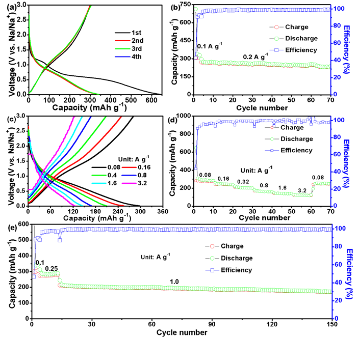 为了研究CoSn/Co3Sn2@C纳米盒子的Na+存储特性,我们组装了Na//CoSn/Co3Sn2@C半电池,并进行了相应的恒流充放电测试。如图5a为CoSn/Co3Sn2@C纳米盒子在80mAg-1电流密度下前四次容量-电压曲线,可以看出首次充放电比容量为641.3mAhg-1,首次库伦效率为46.81%。如图5b所示,CoSn/Co3Sn2@C纳米盒子在0.2Ag-1下循环70次后依然有283.1mAhg-1的比容量。CoSn/Co3Sn2@C纳米盒子在不同电流密度下的容量-电压曲线(从80增加到3200mAg-1)如图5c所示。从图5d可以看出,CoSn/Co3Sn2@C纳米盒子在80、160、320、800、1600、800、1600mAg-1电流密度下的比容量分别为290.2、246.6、205.1、166.0、142.3和124.1mAhg-1。图5e所示性能,这些CoSn/Co3Sn2@C纳米盒子在1000mAg-1下的循环150次后依然有171.9mAhg-1的比容量。这种CoSn/Co3Sn2@C纳米盒子的优点可以概括如下:CoSn/Co3Sn2@C纳米盒子独特的纳米盒子结构提供了足够的空隙空间来缓冲离子往复脱嵌过程中的体积膨胀。此外,纳米盒子的结构有利于电解质的渗透,有利于离子和电子的运输。最后,碳壳可以保持材料的结构稳定性,从而获得良好的电化学性能。