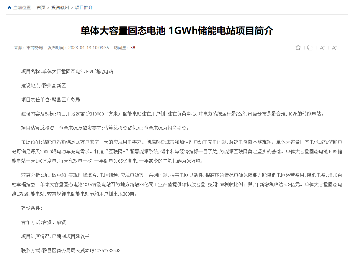 中国粉体网讯 4月13日,赣江商务局发布项目简介,拟投建单体大容量固态电池 1GWh储能电站。据悉,该储能电站建在用户侧负荷中心,用地20亩(约10000平方米),项目估算总投资45亿元,资金来源为招商引资。