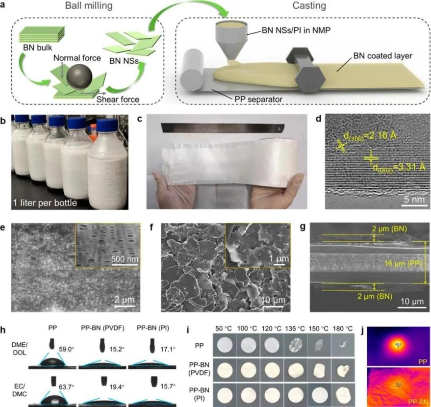 氮化硼是一种无毒、耐高温、耐腐蚀、高导热、高绝缘,性能优良的陶瓷材料。清华大学深圳国际研究生院周光敏副教授、丘陵副教授等人使用了一种简单的方法,即将大规模制备的超薄六方氮化硼 (h-BN)/聚酰亚胺 (PI) 层涂覆在商用聚丙烯 (PP)隔膜上以实现低成本诱导稳定的SEI形成。