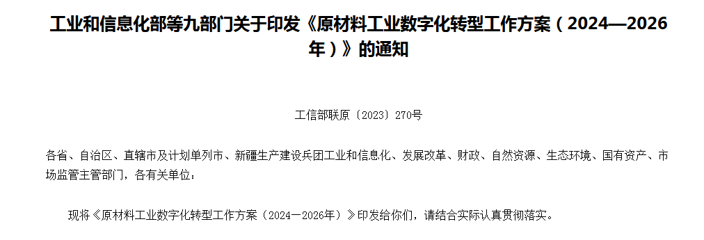 中国粉体网讯 近日,工业和信息化部、国家发展改革委、财政部、自然资源部、生态环境部、国务院国资委、市场监管总局、中国科学院、中国工程院联合印发了《原材料工业数字化转型工作方案(2024—2026年)》(以下简称《工作方案》)。据中国粉体网了解,这是第一个关于原材料工业数字化转型的工作方案文件。