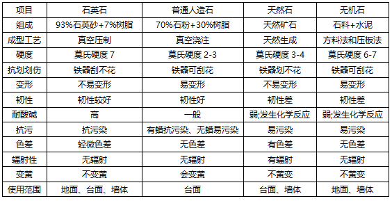 石英石与其他常见面材性能指标的对比:
