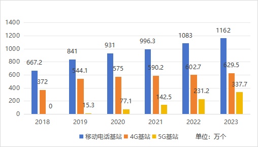 2018-2023年通信基站发展情况(数据来源:工业与信息化部)