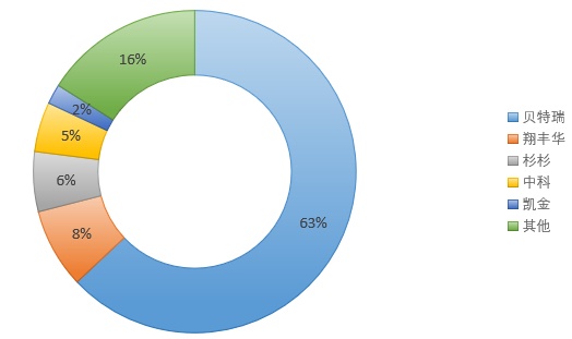 目前,我国天然石墨行业产业集中度较高。在石墨市场竞争格局中,贝特瑞以63%的市场份额占据主导地位,位居第二的是翔丰华,市场份额为8%。杉杉、中科、凯金依次占比为6%、5%、2%。