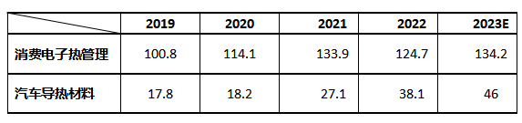 预计2023年我国消费电子热管理市场规模可达134.2亿元,汽车导热材料市场规模可达46亿元。