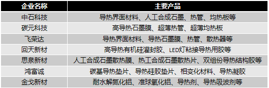 我国导热材料市场已经形成了较为稳定的竞争格局,少数国内企业如中石科技、碳元科技、飞荣达等已逐渐具备自主研发和生产中高端产品的能力,中端市场竞争激烈,致力于在成本和价格上做出平衡,低端市场利润驱动型企业众多,质量与工艺水平较低。部分国内导热企业产品布局如下: