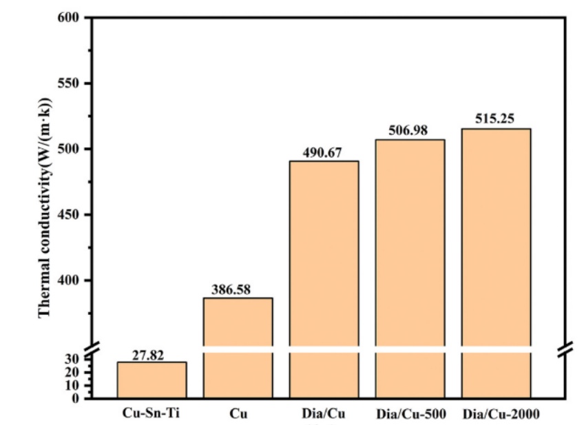 数据显示,实验中三种金刚石/Cu复合材料样品的TC值均高于纯铜。此外,加入金刚石颗粒可以进一步提高复合材料的TC。其中,含有2000目金刚石颗粒的样品具有前所未有的515.25 W/(m·K)的TC,而总金刚石含量低至22.58vol%。
