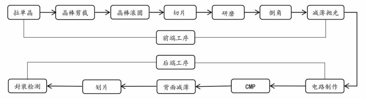 半导体加工是从晶棒到单个芯片的过程。从工序上分类,半导体材料的前端加工工艺主要包括晶棒剪裁、晶棒滚圆、晶棒切片、晶圆片研磨、晶圆片倒角与磨边以及晶圆片减薄与抛光;后续封装工艺中包含电路制作、抛光、背面减薄以及划片,这些工序中都离不开金刚石工具的广泛使用。