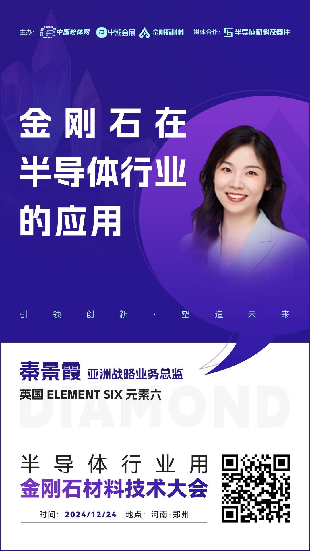 2024年12月24日,中国粉体网将在河南·郑州举办“2024半导体行业用金刚石材料技术大会”。届时,我们邀请到Element Six(元素六)亚洲战略业务总监秦景霞出席本次大会并作题为《金刚石在半导体产业链的相关应用》的报告,将统述如何利用CVD、HPHT金刚石的卓越的硬度,导热,光电,量子等特性在半导体行业的综合应用:从芯片设计, 到芯片制造(前端衬底加工, 后端装配,封装,测试),再到电子设备成品制备。