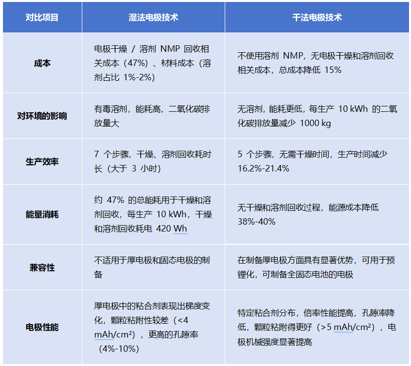 干法电极技术源于“干膜技术”,干膜技术起源于制药、合金制备和瓷器等行业,经过后续的工艺改进和技术突破,该技术被逐渐应用到储能领域。与传统湿法电极技术相比,干法电极技术表现出独特的优势,主要表现在节省成本、降低能耗和提高电极质量。干法电极制备方法主要有粉末喷涂法、黏结剂纤维化成膜法和干压法等。