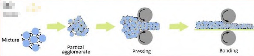 粉末喷涂沉积技术是利用高压气体预混合活性物质、导电剂和黏结剂PTFE,然后在静电喷枪的作用下使粉末带电并喷涂到接地的集流体上,之后通过热轧将粉末粘合并固定在集流体上,得到最终的电极。电极的厚度和密度可以通过热轧过程控制,电极可以在多个辊子之间传递,以获得设定的电极厚度。