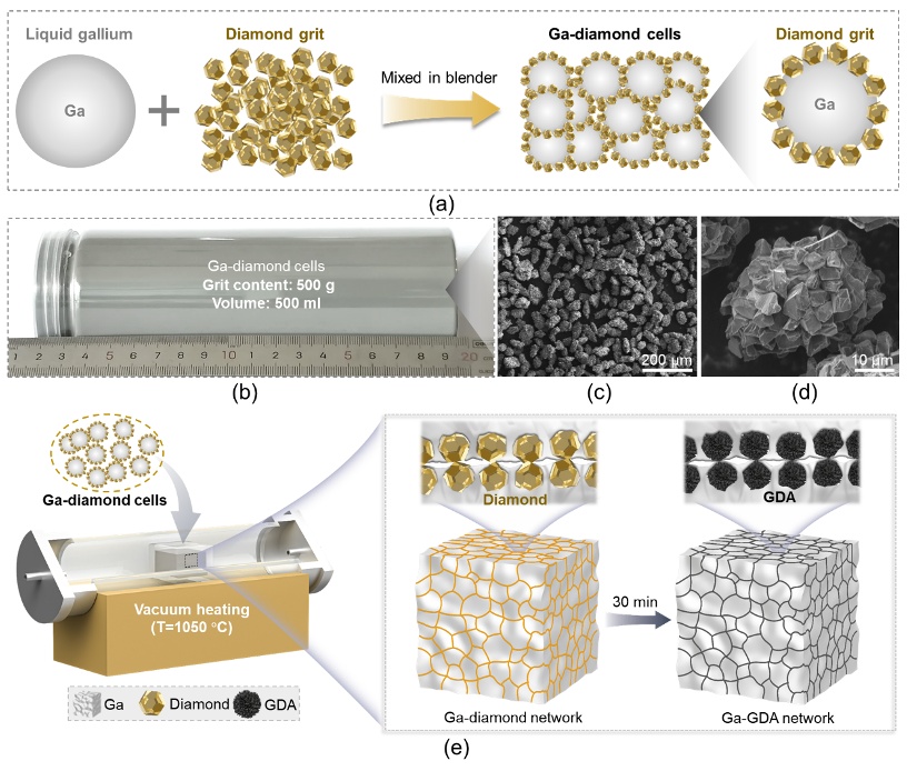 针对这一难题,上海交通大学沈彬教授课题组将液态金属镓微液滴化与快速原位裹覆金刚石颗粒,构筑了一种镓-金刚石“细胞式”的悬浮浸润网络,从而实现了金刚石颗粒多表面的原位石墨烯生长与批量制备。这种“细胞式”的悬浮浸润策略可实现千克级的石墨烯-金刚石共价异质颗粒的制备,相比传统的制备方法的有效产率提升3-5个数量级,具有广阔的工业应用前景。相比传统金刚石磨粒,这一新型磨粒在超硬半导体材料(金刚石、碳化硅等)的抛光加工中具有更高的抛光效率与更高的抛光质量,其原子级材料去除率是传统金刚石磨粒的5倍。