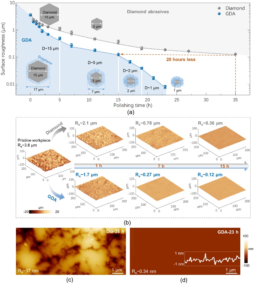 石墨烯共价装甲金刚石磨粒(GDA)与传统金刚石磨粒的抛光性能对比(抛光工件为金刚石):GDA抛光效率显著提升,抛光表面无裂纹