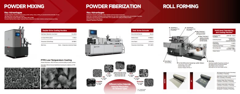 Among these innovations, Shangshui's Double-Drive Coating Machine—widely used for material mixing, particle coating, drying, crushing, and dry-process electrode production—features simulation-designed paddles tailored to different materials.The company’s Twin-screw Extruder effectively addresses key process challenges such as inconsistent fibrillation degrees and uneven fiber distribution. Additionally, its Multi-level Calendering and Coating Machine enables multi-functional roll pressing and other advanced capabilities.