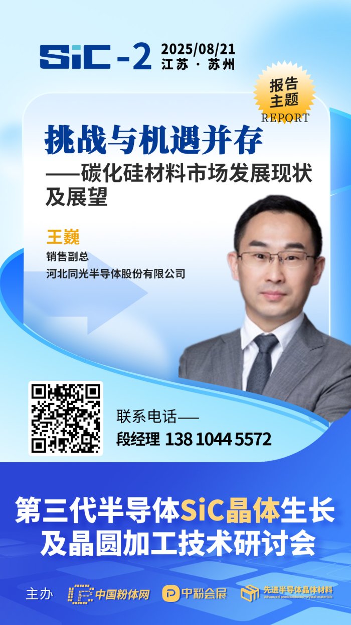 未来,SiC衬底行业发展方向该指向何方?2025年8月21日,中国粉体网将在苏州举办第三代半导体SiC晶体生长及晶圆加工技术研讨会。届时,来自河北同光半导体股份有限公司销售副总王巍将带来题为《挑战与机遇并存——碳化硅材料市场发展现状及展望》的报告,报告将评估当前SiC衬底市场的竞争格局,以及未来几年内可能影响行业发展的关键因素。将提出对SiC衬底产业化进程的展望。