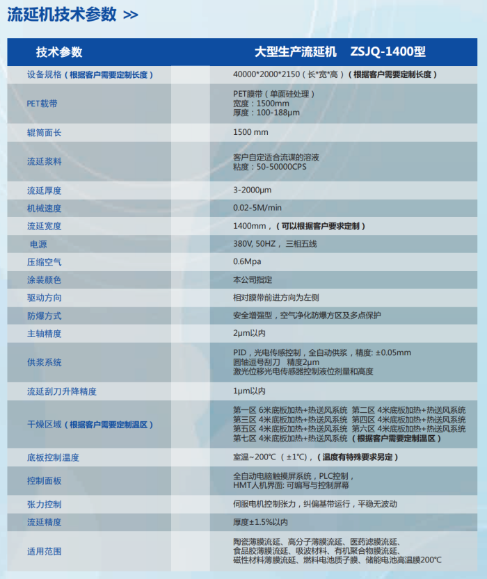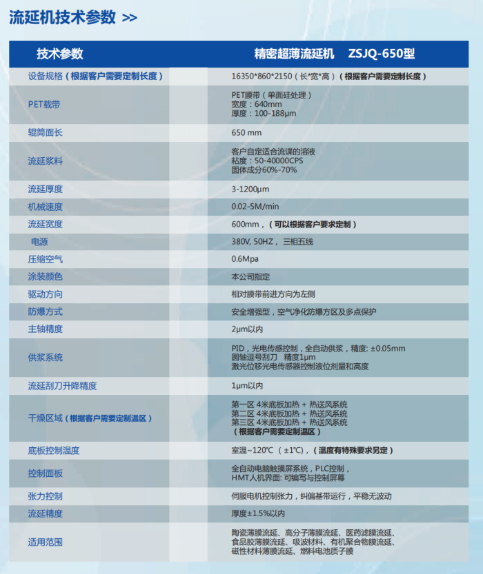 公司主要产品有流延机(涂布机),49/S电子晶体外壳,石油抽油泵柱塞及金属表面处理。公司研发设计的流延机引进国外先进技术,其性能、要求、技术,外观、环保、节能在国内属领先水平,质量好,性价比高。对于流延机的研发制造始终以高标准、高技术、高门槛的研究创新精神去突破。严谨专注的态度去优化性能,客户至上的态度去解决痛点,开拓创新的态度去攻克技术难关,追求卓越的态度去提升工艺精度。研发生产的流延机完全可以流延固态电池膜、液流电池膜、氢燃料电池膜、氧化铝﹑氮化铝﹑氧化锆﹑铁氧体﹑防弹衣膜、吸波波材料、橡胶薄膜、石墨烯、有机聚合物膜、金属粉滤膜、封装陶瓷类产品和各种过滤膜并销往国内各企业,赢得了不错的好评。
