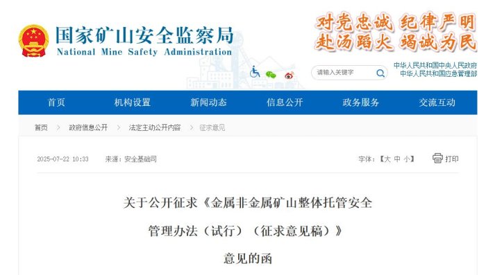 近日,国家矿山安全监察局公开征求《金属非金属矿山整体托管安全管理办法(试行)(征求意见稿)》,明确从2026年1月1日起,金属与非金属矿山整体托管必须重新申领安全许可证。