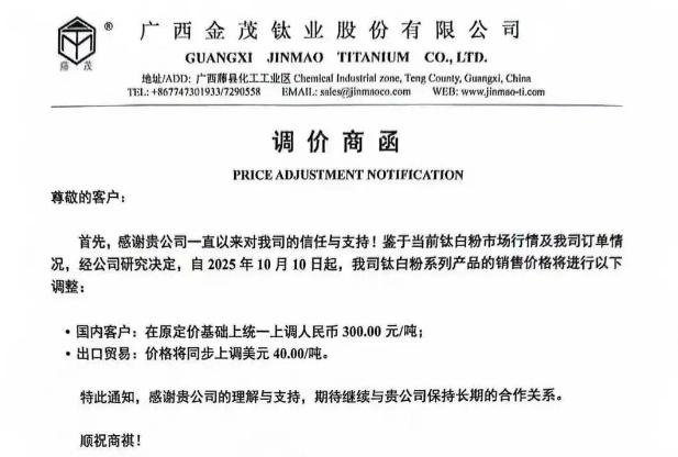 10月10日左右,龙佰集团、中核华原钛白、安纳达、广西金茂钛业、蓝星大华化工、潜江方圆钛白、云南大互通钛业、江苏镇钛化工、攀枝花恒通钛业、山东金海钛业等多家企业的钛白粉开始涨价,形成一波集体涨价浪潮,国内市场调价幅度普遍锁定300元/吨,国际市场上调40-50美元/吨不等。