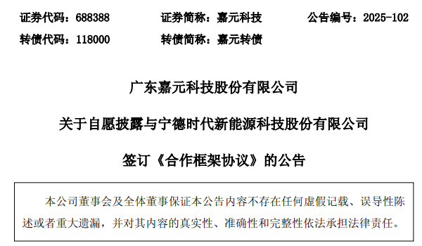 中国粉体网讯 11月5日,广东嘉元科技股份有限公司(简称:嘉元科技)发布公告称,公司与宁德时代于11月4日在宁德市签订《合作框架协议》,在现有业务合作的基础上,双方同意进一步扩大业务关系的深度和广度,嘉元科技在相关方面满足宁德时代要求的前提下,宁德时代根据实际需求将嘉元科技作为铜箔产品的优选供应商。