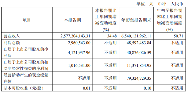 据10月30日嘉元科技发布的2025年第三季度报告显示,嘉元科技前三季度共实现营业收入65.4亿元,同比增长50.71%,其中第三季度实现营收25.7亿元,同比增长34.48%。