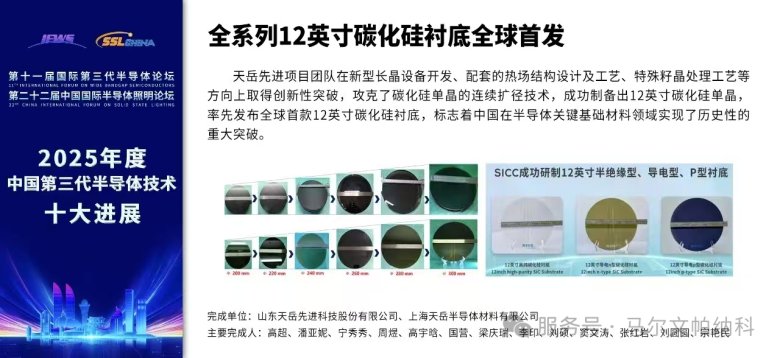 山东天岳先进科技股份有限公司发布全球首款12英寸碳化硅衬底,标志着中国在半导体关键基础材料领域实现了历史性的重大突破,彰显了中国新一代半导体材料技术的国际领先地位。