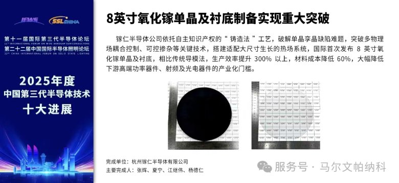 镓仁半导体成为国际首家掌握8英寸氧化镓单晶及衬底制备技术的企业,仅用三年完成从2英寸到8英寸的跨越式发展,创造尺寸快速迭代的行业纪录。该成果填补国际大尺寸氧化镓单晶及衬底领域空白,助力我国超宽禁带半导体从“跟跑”到“领跑”,为新能源汽车快充、智能电网等领域提供关键材料支撑。