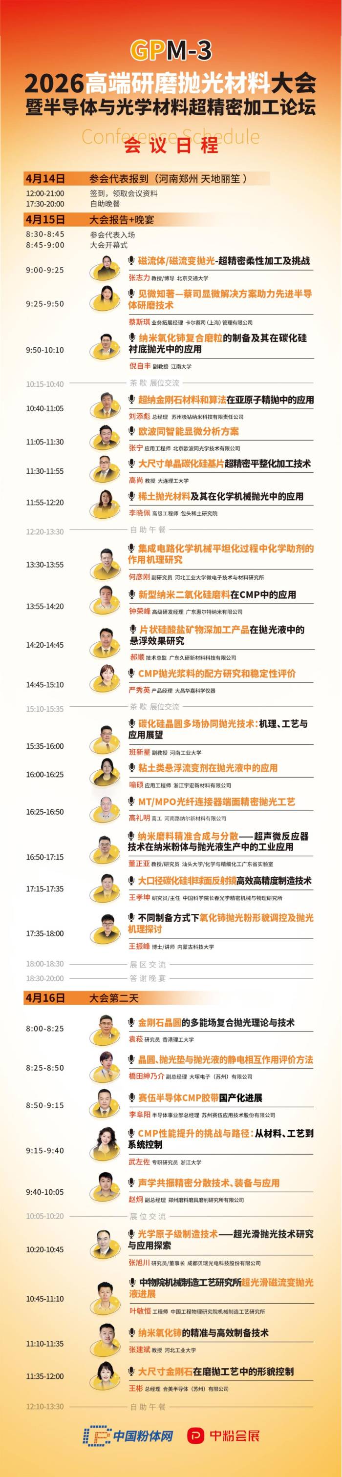 在此背景下,中国粉体网将于2026年4月15-16日于郑州举办2026高端研磨抛光材料大会暨半导体与光学材料超精密加工论坛。本次大会将汇聚国内行业专家、学者、技术人员及企业代表,围绕高端研磨抛光材料、超精密加工技术、相关装备与应用等议题展开深入交流与研讨。