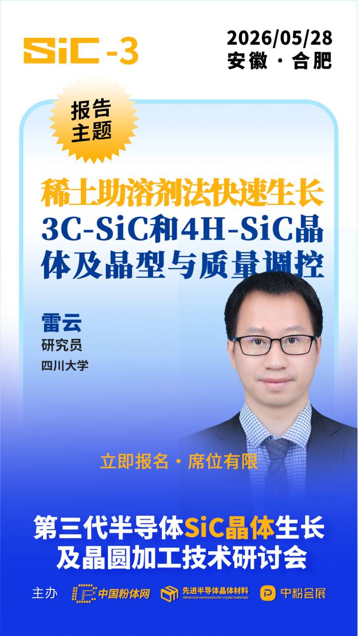 2026年5月28日,中国粉体网将在安徽合肥举办“第三代半导体SiC晶体生长及晶圆加工技术研讨会”。届时,四川大学研究员雷云将带来题为《稀土助溶剂法快速生长3C-SiC和4H-SiC晶体及晶型与质量调控》的报告,聚焦稀土助溶剂在SiC晶体高效生长、晶型精准调控与质量提升方面的核心技术与最新进展。