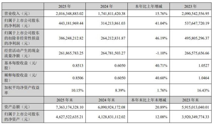 中国粉体网讯 近日,湖北菲利华石英玻璃股份有限公司(简称“菲利华”)发布2025年年度报告。报告期内,公司实现营业收入20.16亿元,较2024年同期增长15.76%;归属于上市公司股东的净利润4.43亿元,较2024年同期增长41.04%;扣除非经常性损益后的净利润3.86亿元,同比增长46.19%,核心主业盈利质量持续提升。