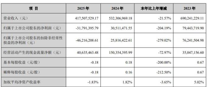 中国粉体网讯 近日,广东中旗新材料股份有限公司(简称“中旗新材”)发布2025年年度报告。报告期内,公司实现营业收入417,507,529.17元,较2024年同期下降21.57%;归属于上市公司股东的净利润-31,791,395.79元,较2024年同期下降204.19%,由盈转亏。
