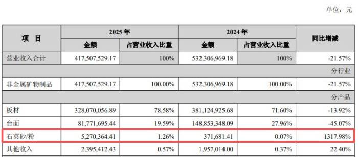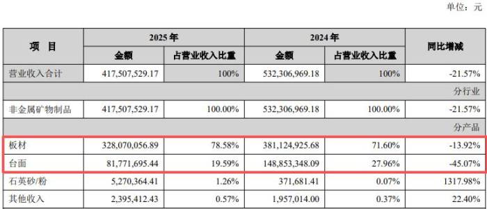 报告期内,公司核心业务与人造石英石主业深度绑定,受下游装修、地产需求下滑影响,板材收入3.28亿元,同比下降13.92%;台面收入8177.17万元,同比大幅下滑45.07%,成为营收下滑主要拖累项。