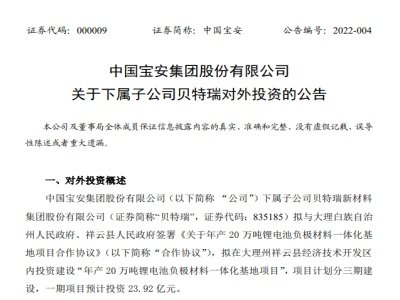 贝特瑞再添负极产能 年产20万吨负极一体化项目落户大理